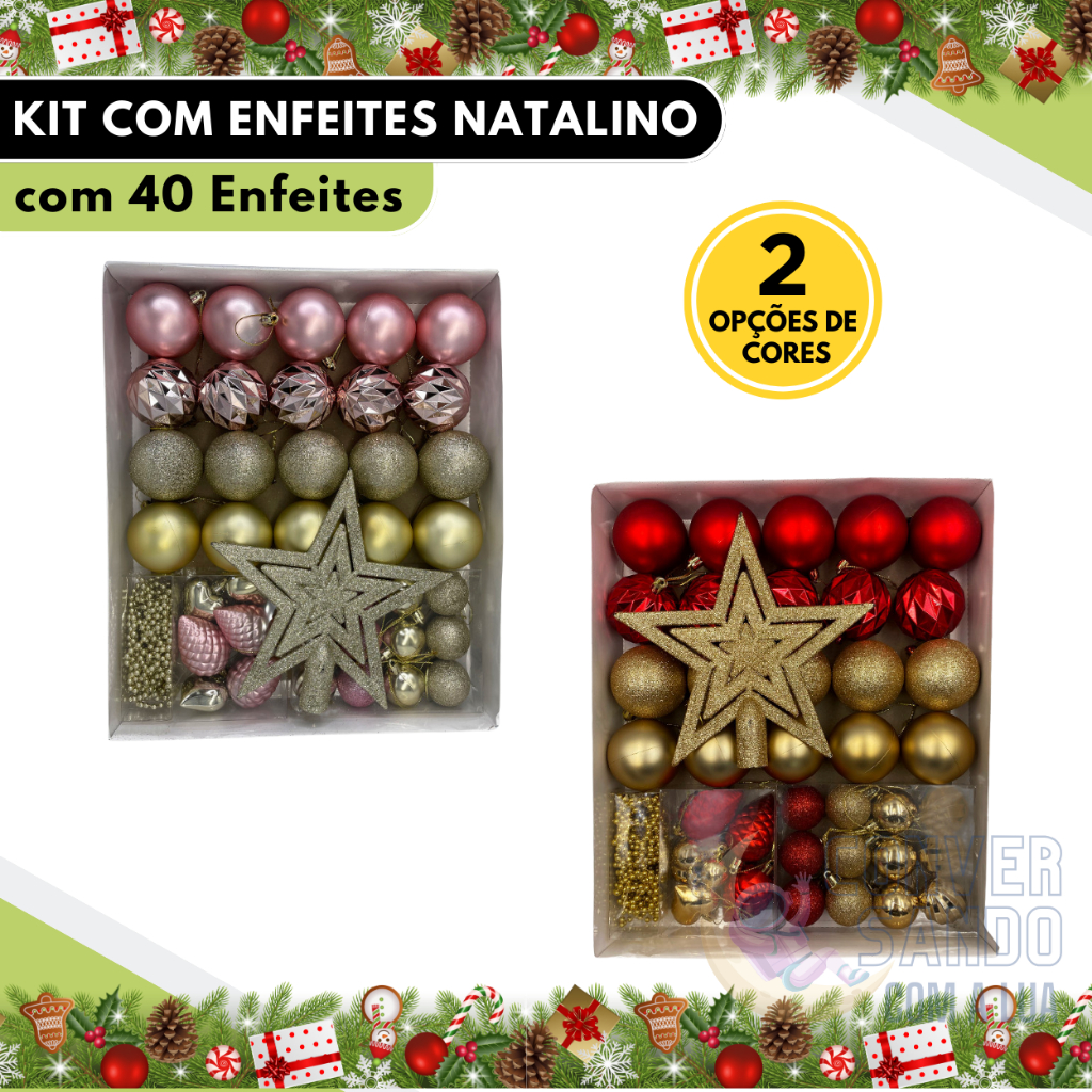 Kit com Enfeites Natalino Completo 40 Itens Vermelho com Dourado ou Rosa com Dourado Árvore de Natal Papai Noel Presente