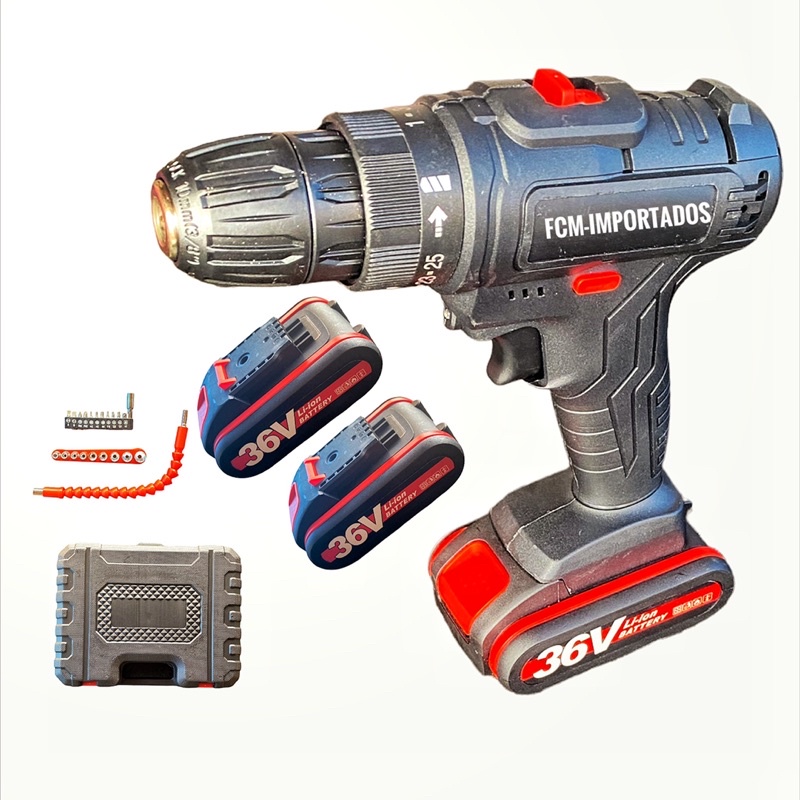 parafusadeira furadeira 36v com duas baterias recarregáveis kit com 24pecas e maleta de transporte mega promoção