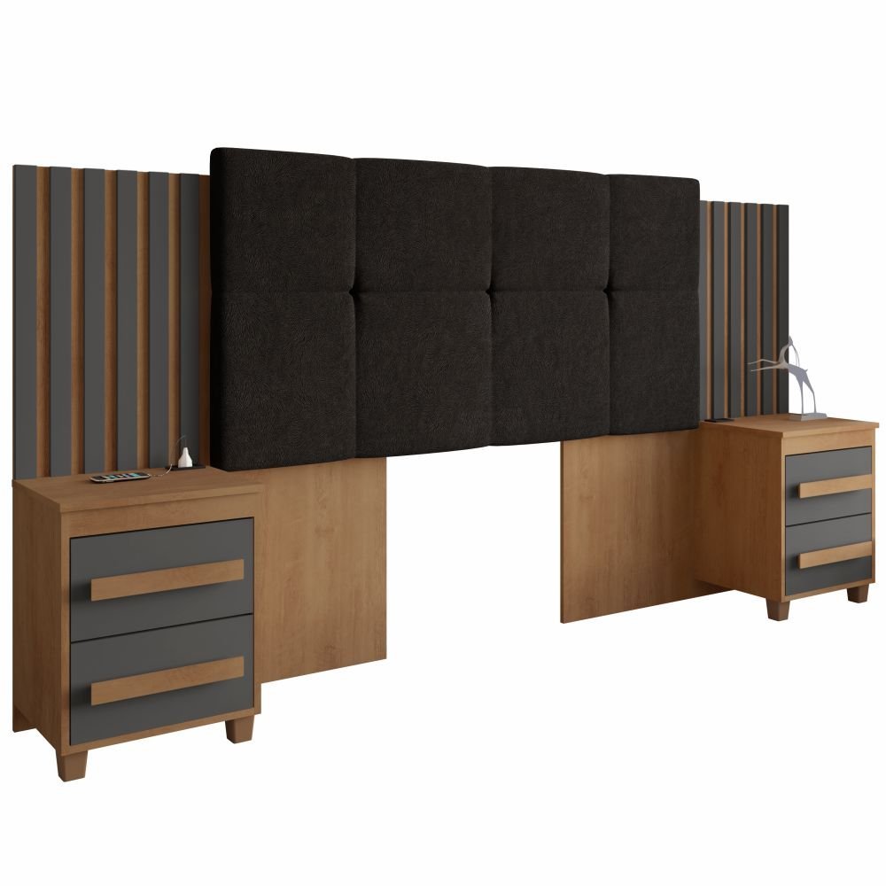 Cabeceira Estofada Para Cama Box Casal/queen/king Rv Móveis Suíça Com 02 Mesas De Cabeceira Com Tomada Cinamomo Grafite
