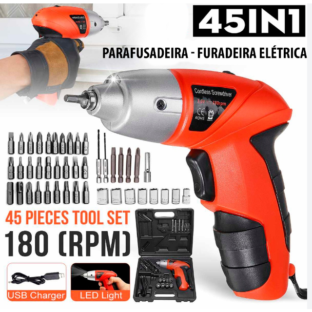 Parafusadeira Furadeira sem Fio Recarregável com Maleta 45 peças