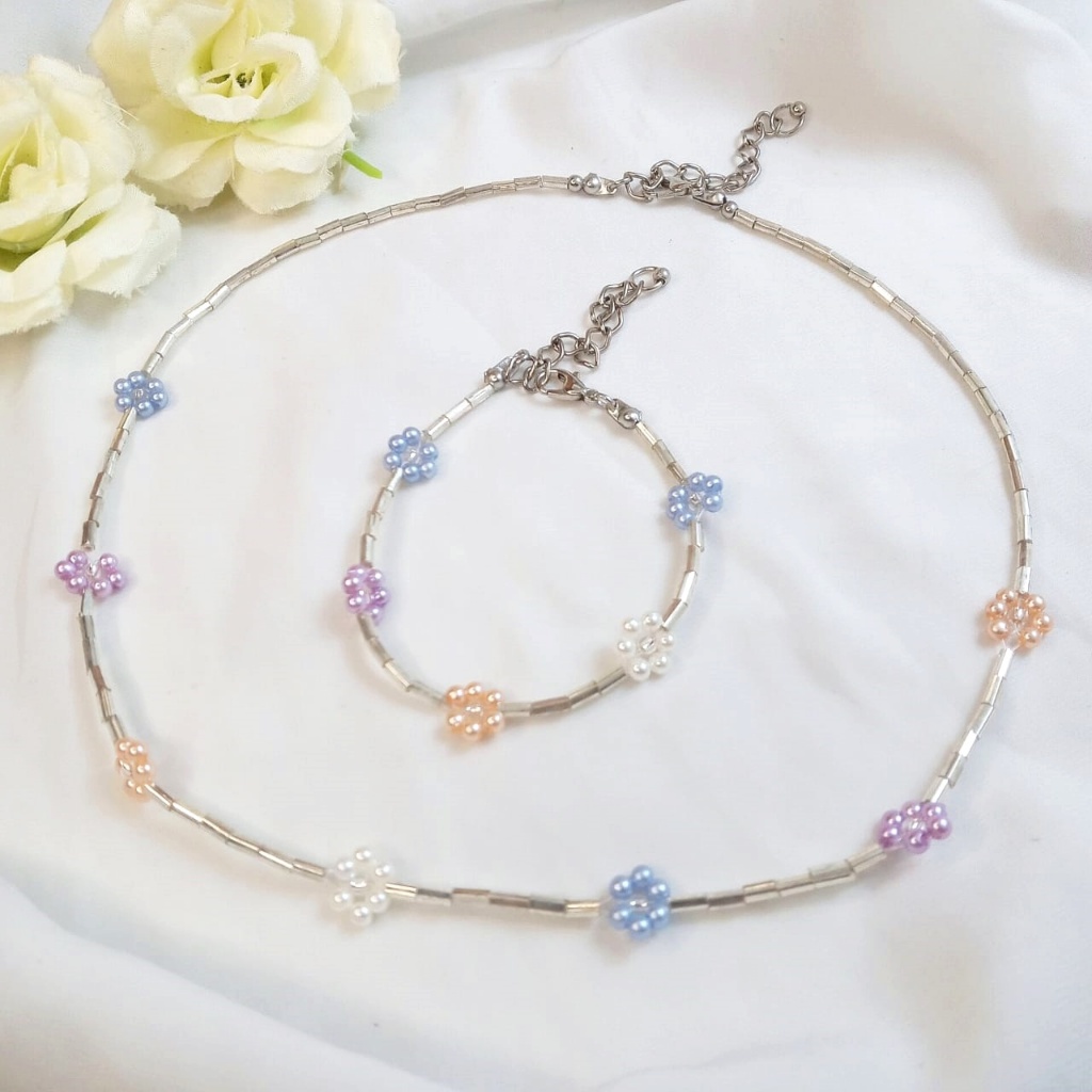 Colar Prata - Colar Feminino - Colar Chocker - Colar de Flor Coloridas de Pérolas e Miçangas Prata - Daisy Silver Variado