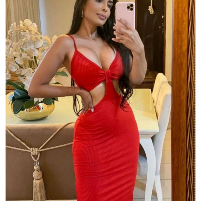 Vestido De Alcinha Midi Com Fenda Lateral Malha Canelada