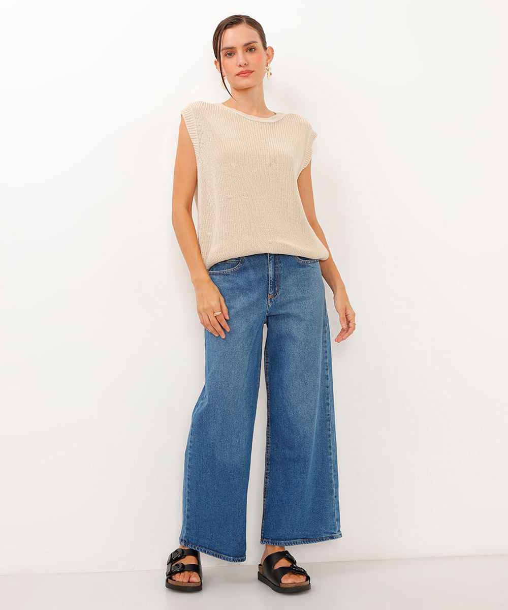 calça jeans wide leg slim cintura super alta com bolsos azul médio