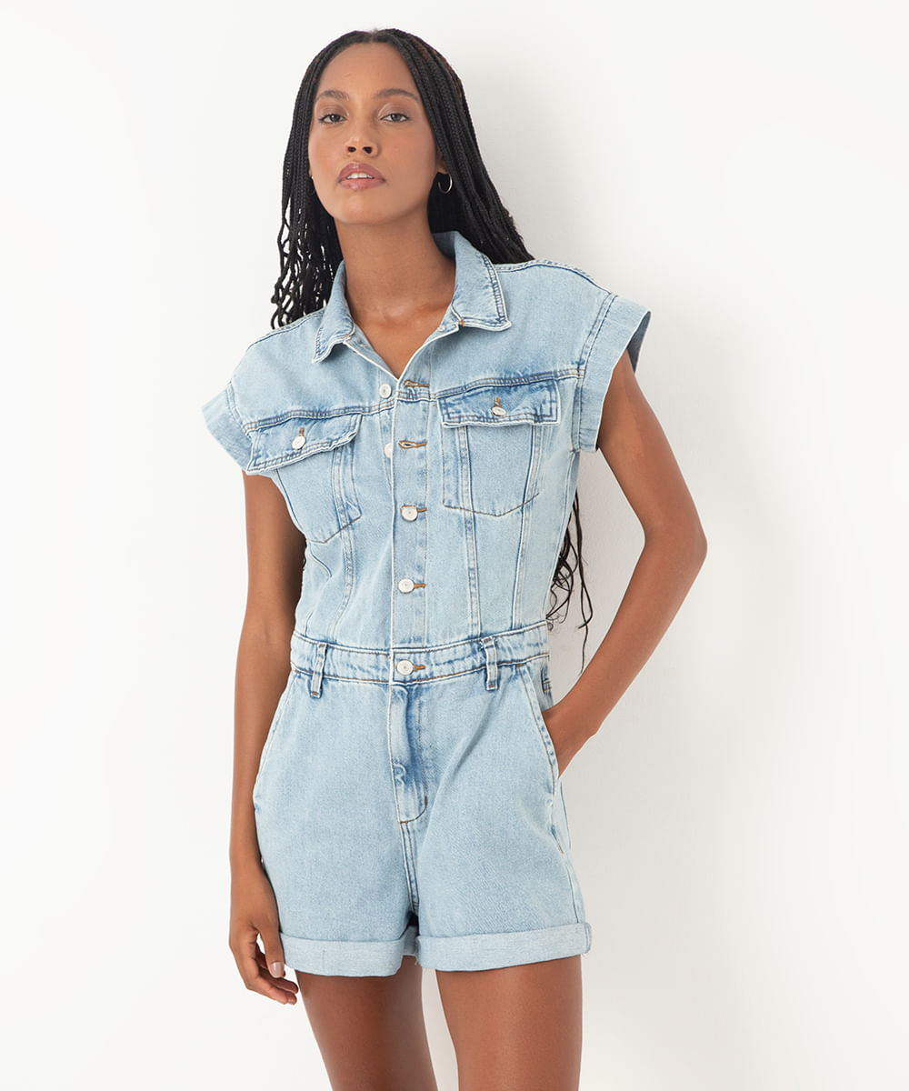 Macaquinho Jeans Sem Lycra Com Botão Feminina Com Manga Curta Princesa