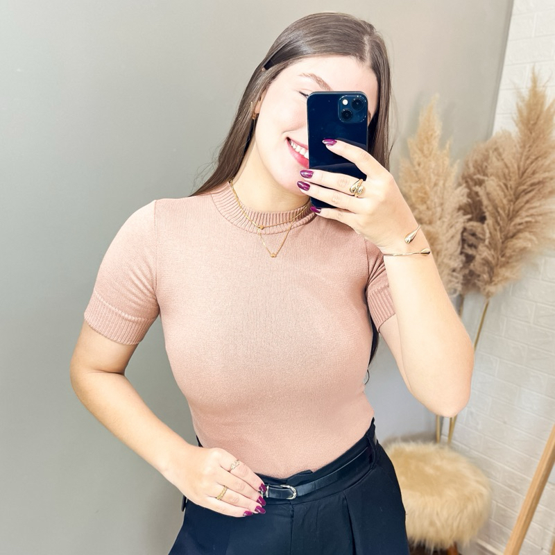 Blusa básica feminina gola redonda manga curta de tricot