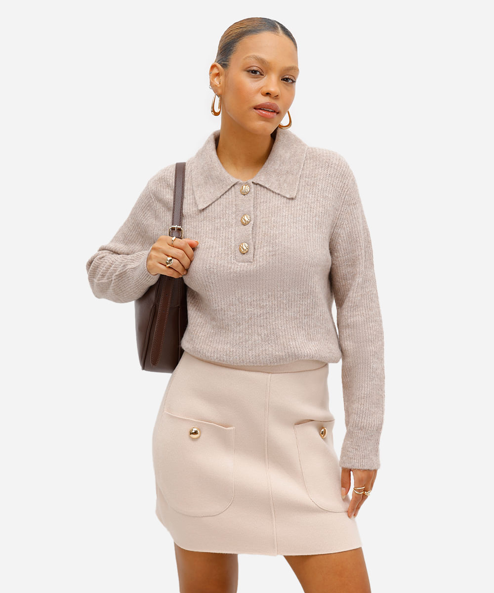 suéter feminino de tricot com gola manga longa bege
