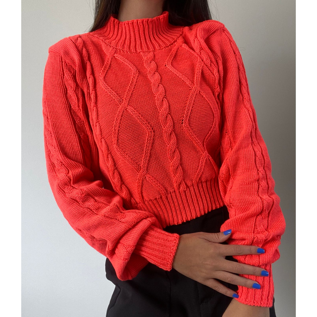 Blusa de Frio Cropped Tricot Manga Longa Trancinha Inverno