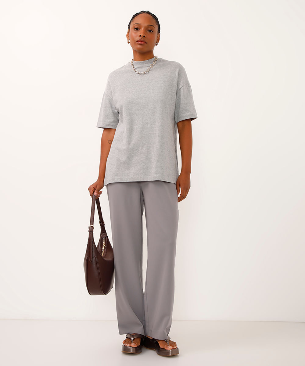calça reta feminina de alfaiataria com pregas e botões marrom