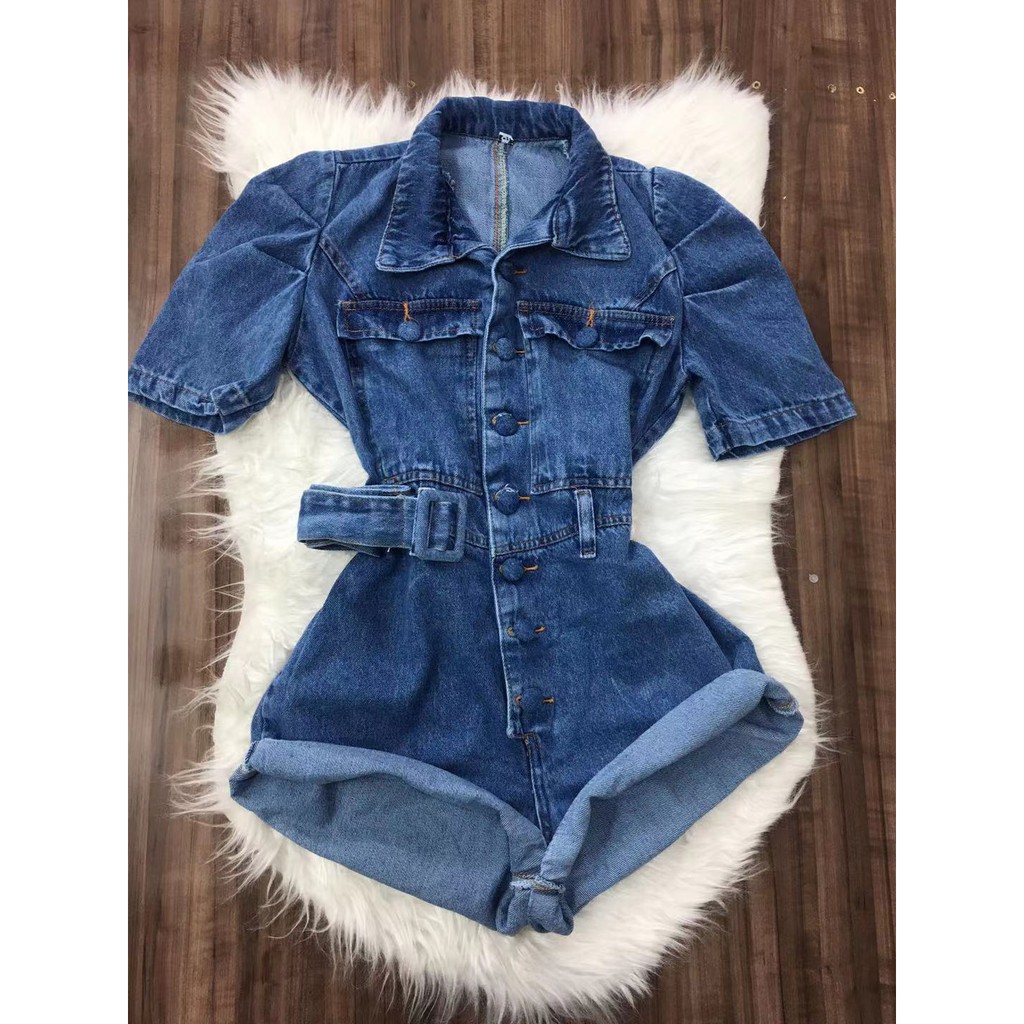 Macaquinho Jeans Sem Lycra Com Botão Feminina Com Manga Curta Princesa