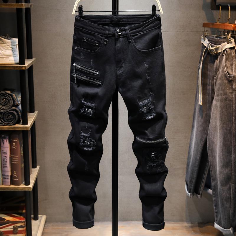 Roupa íntima masculina Calça Jeans Longa Calça Jeans Européia Estação Européia High-End Black Jeans Homem Street Wear Ruffian Handsome Motocicleta Ripped Patch Elástico Slim-fit Skinny Pants Spring