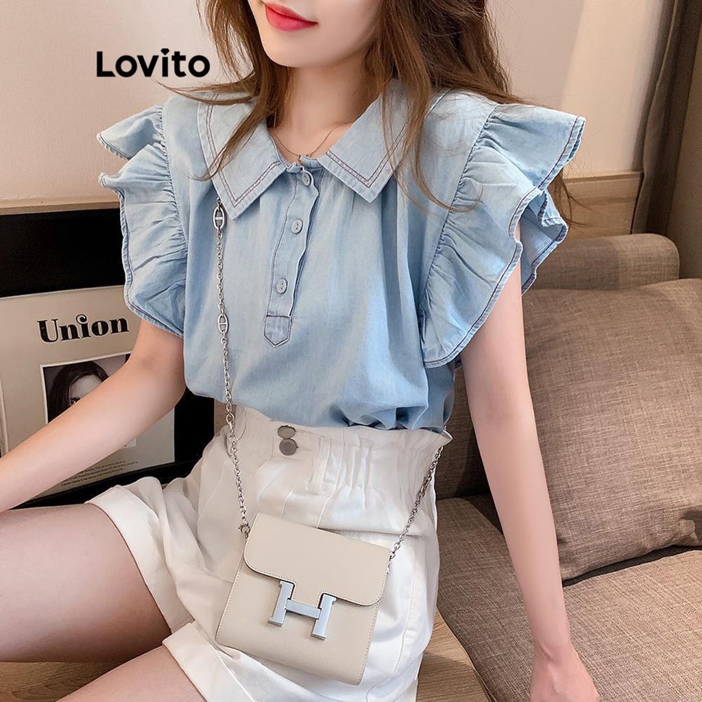Lovito Elegante Blusa Feminina Lisa de Manga Curta com Babados e Gola LNE07099 (Azul)