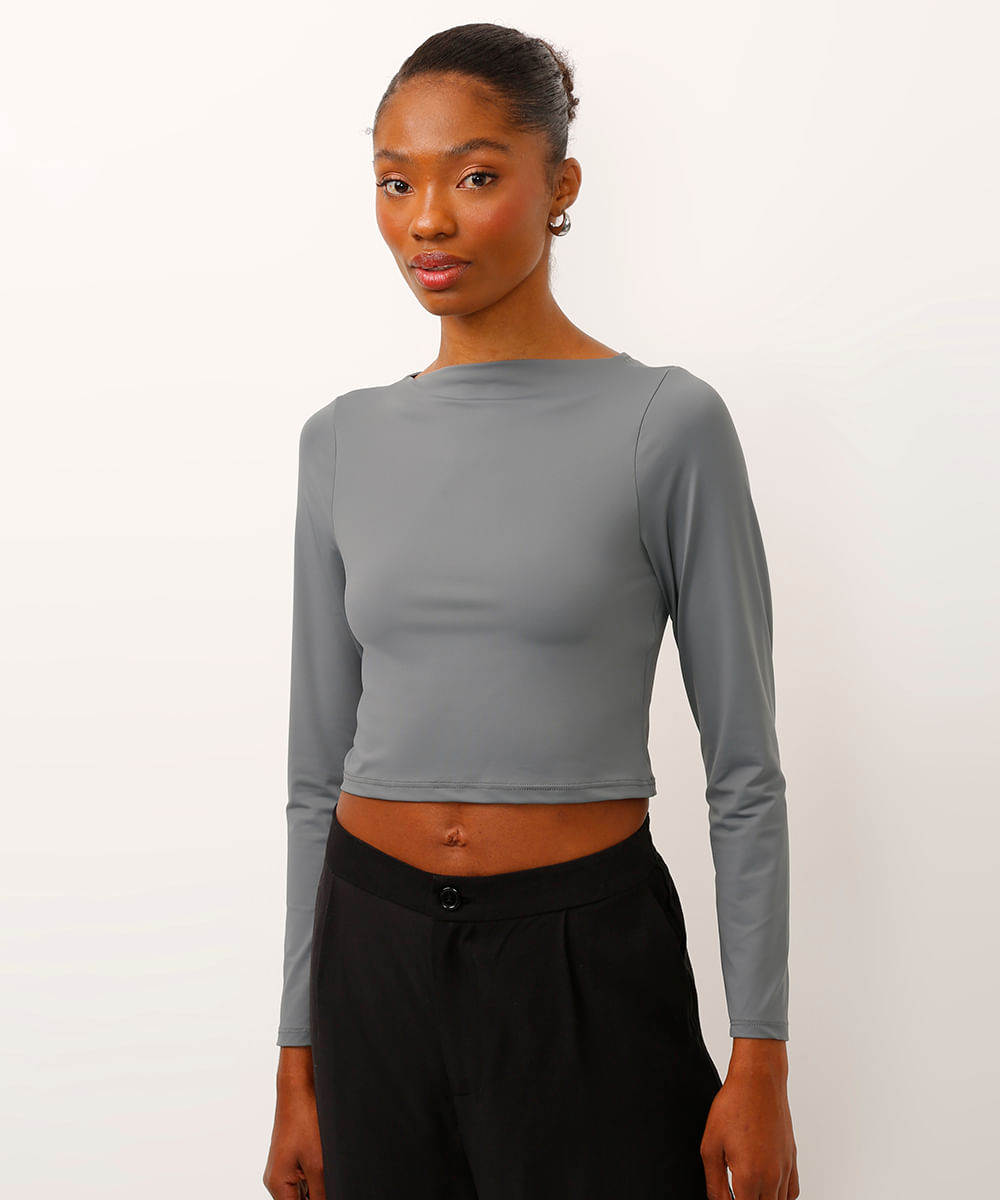 blusa cropped decote canoa manga longa cinza