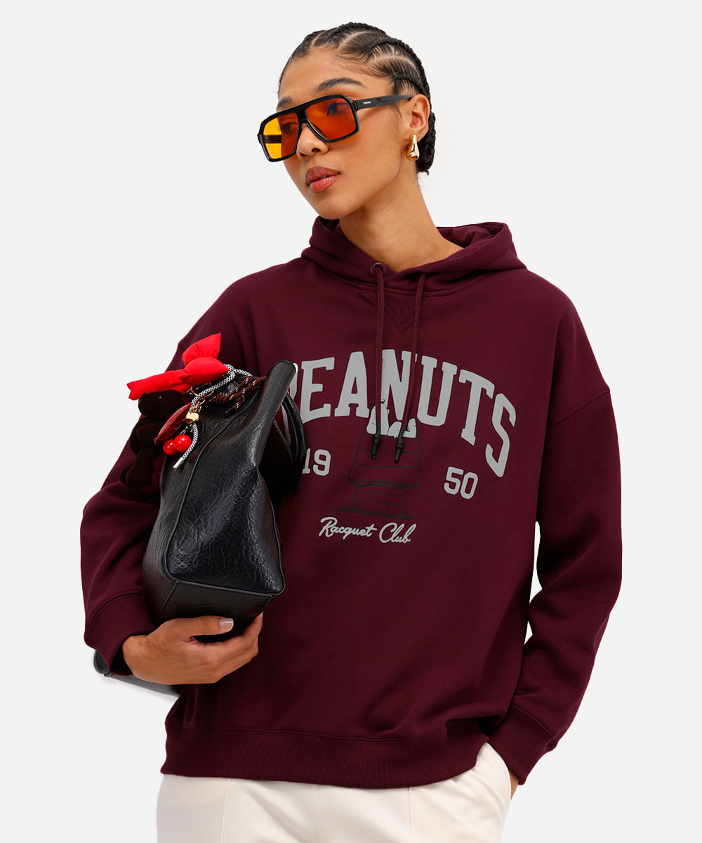 blusão feminino de moletom felpado com capuz snoopy vinho