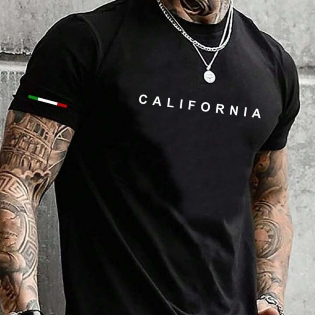 Camiseta Masculina California Preta De Manga Curta Gola Redonda Estampada 100% Algodão Reforço Ombro a Ombro.