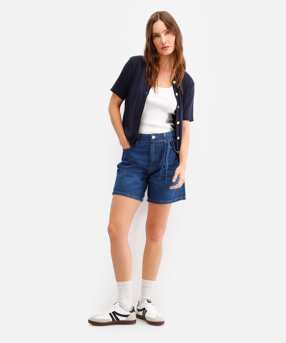 bermuda feminina jeans cintura média com cordão azul