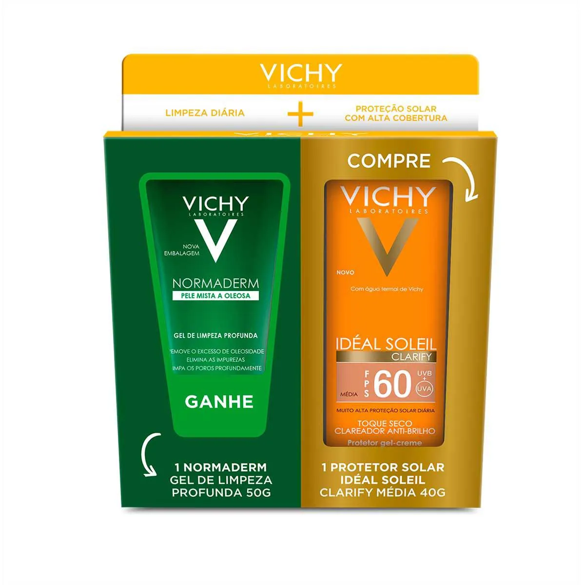 Kit Vichy Protetor Solar Idéal Soleil Clarify Média FPS 60 40g + Gel de Limpeza Profunda Normaderm 50g