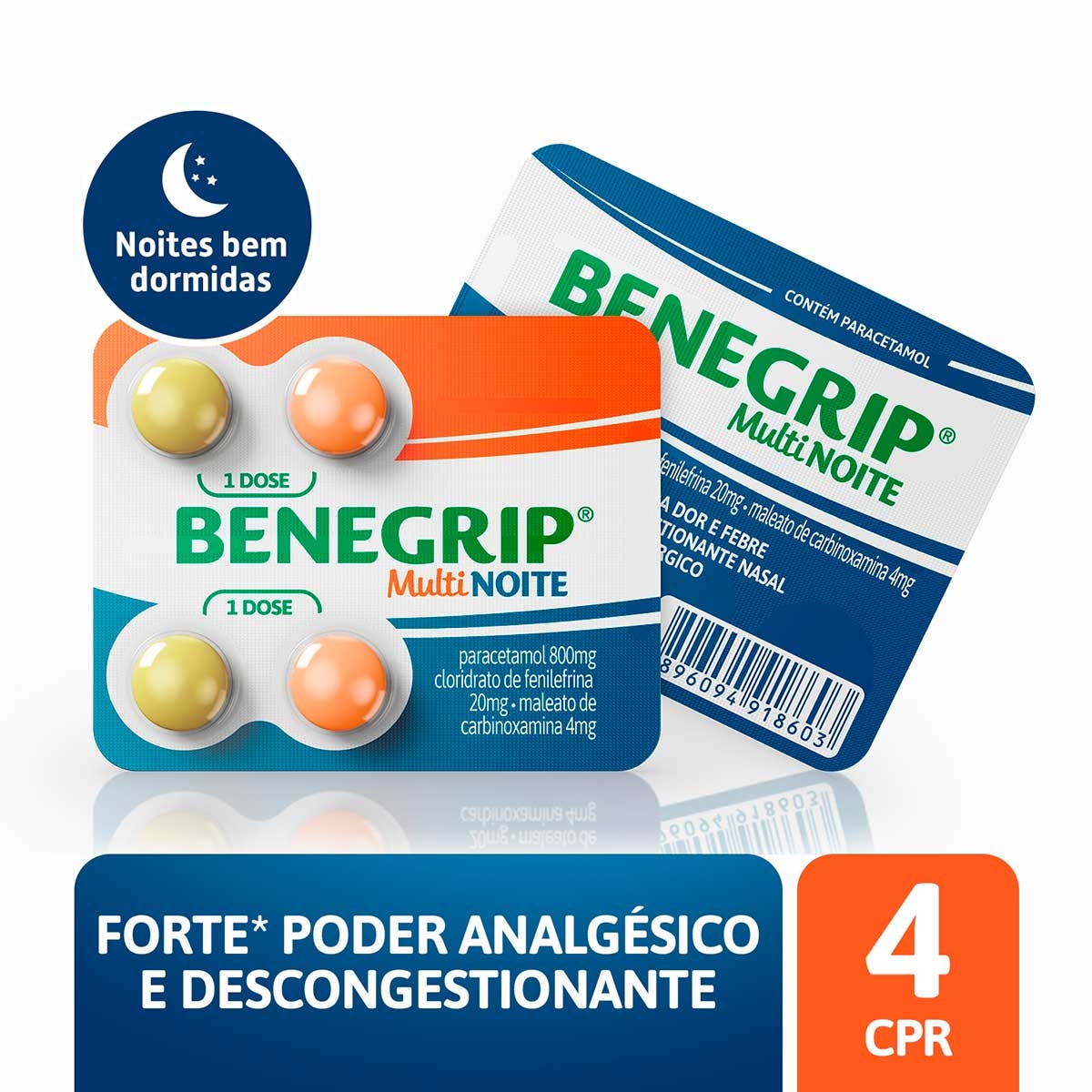 Benegrip MultiNoite Paracetamol 800mg + Cloridrato Fenillefrina 20mg + Maleato de Carbinoxamina 4mg 4 comprimidos