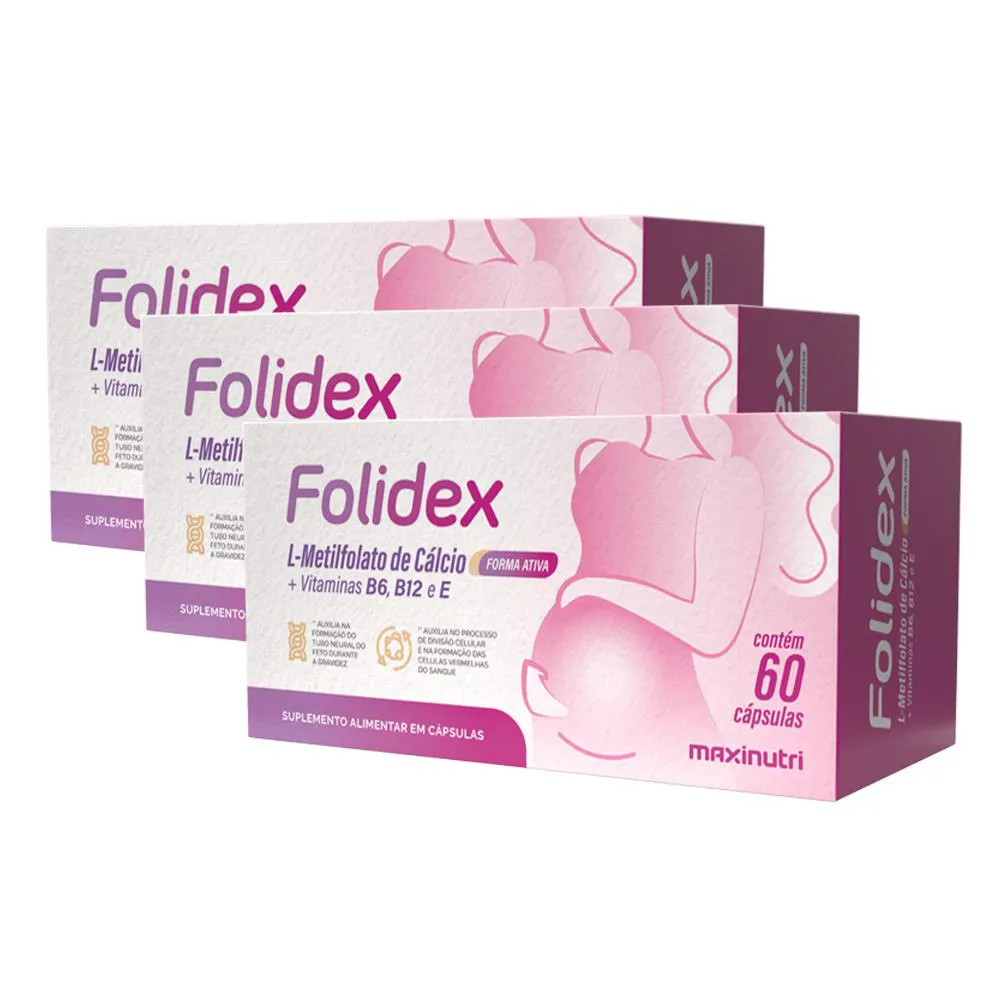 KIT 3 FOLIDEX L-METILFOLATO DE CáLCIO VITAMINAS B6-B12-E 60 CáPS MAXINUTRI