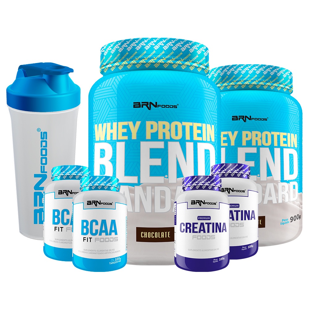 Kit 2x Whey Protein Blend Standard 900g + 2x Premium Creatina 100g + 2x BCAA 100g + Coqueteleira - BRNFOODS