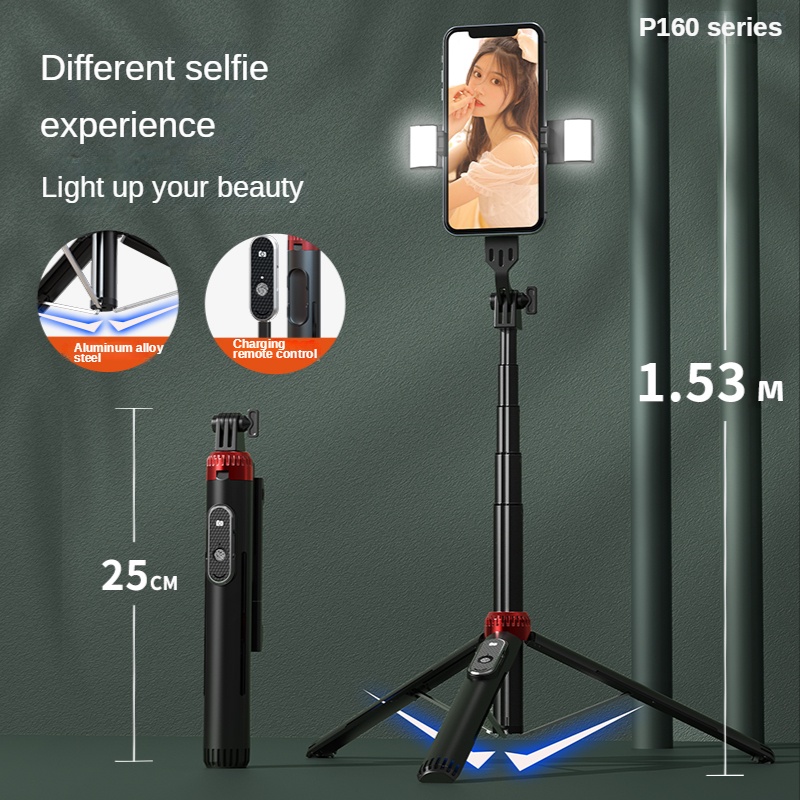 P160 Bastão Selfie Bluetooth Sem Fio 1.53M Com Tripé Dobrável Luz De Preenchimento Duplo Para Câmeras Gopro Action Smartphone