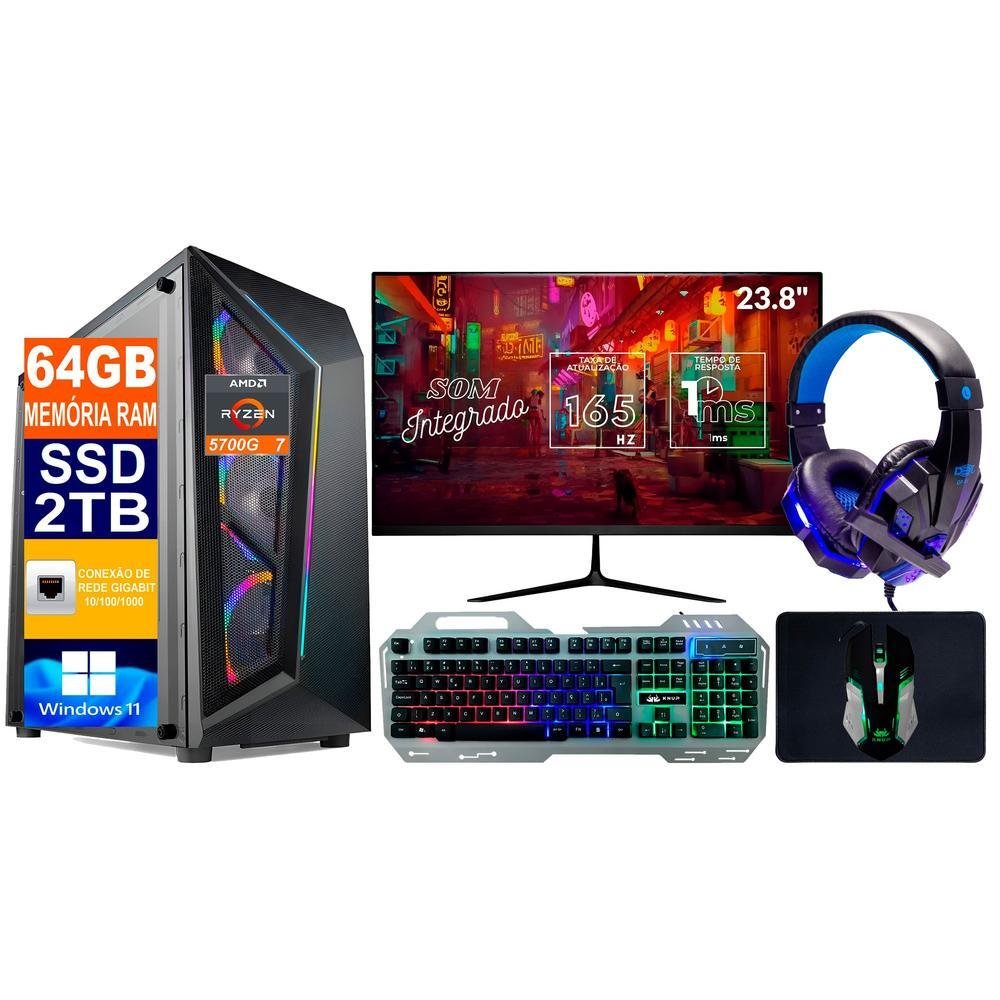 PC Gamer Tech Power Shop AMD Ryzen 7 5700G, 64GB RAM, SSD 1TB NVMe M.2, Windows 11 Pro + Monitor 23.8 Polegadas 165Hz + Teclado + Mouse + Headset