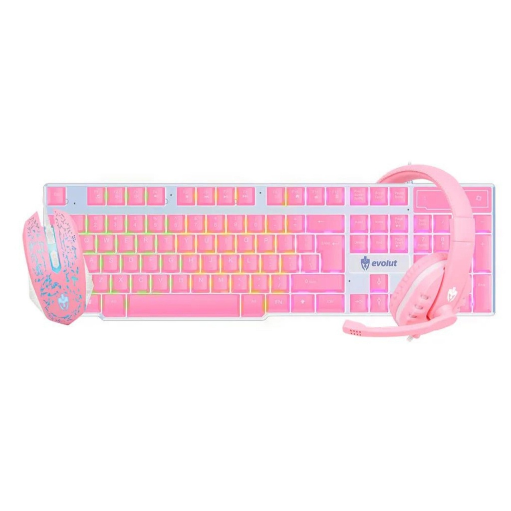 Teclado Mouse Fone Gamer Conjunto Evolut EG-53 Kit Starter Rosa