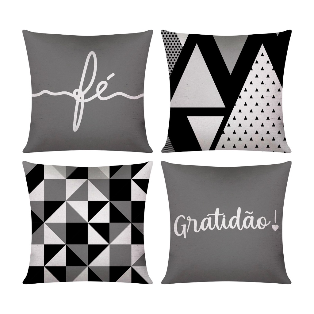 Kit c/ 4 Capas de Almofada Decorativas Geométricas 42x42 Gratidão e Fé Cinza