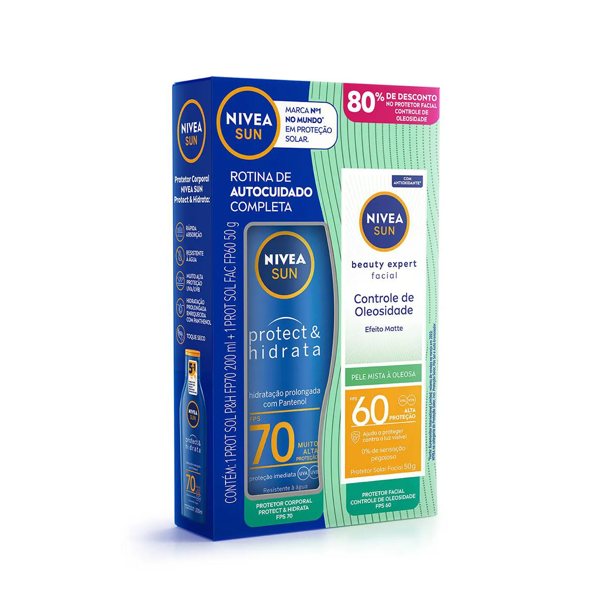 Kit Nivea Sun Rotina de Autocuidado Completa Protetor Solar Protect & Hidrata FPS50 200ml + Protetor Solar Facial Beauty Oleosidade FPS60 50ml