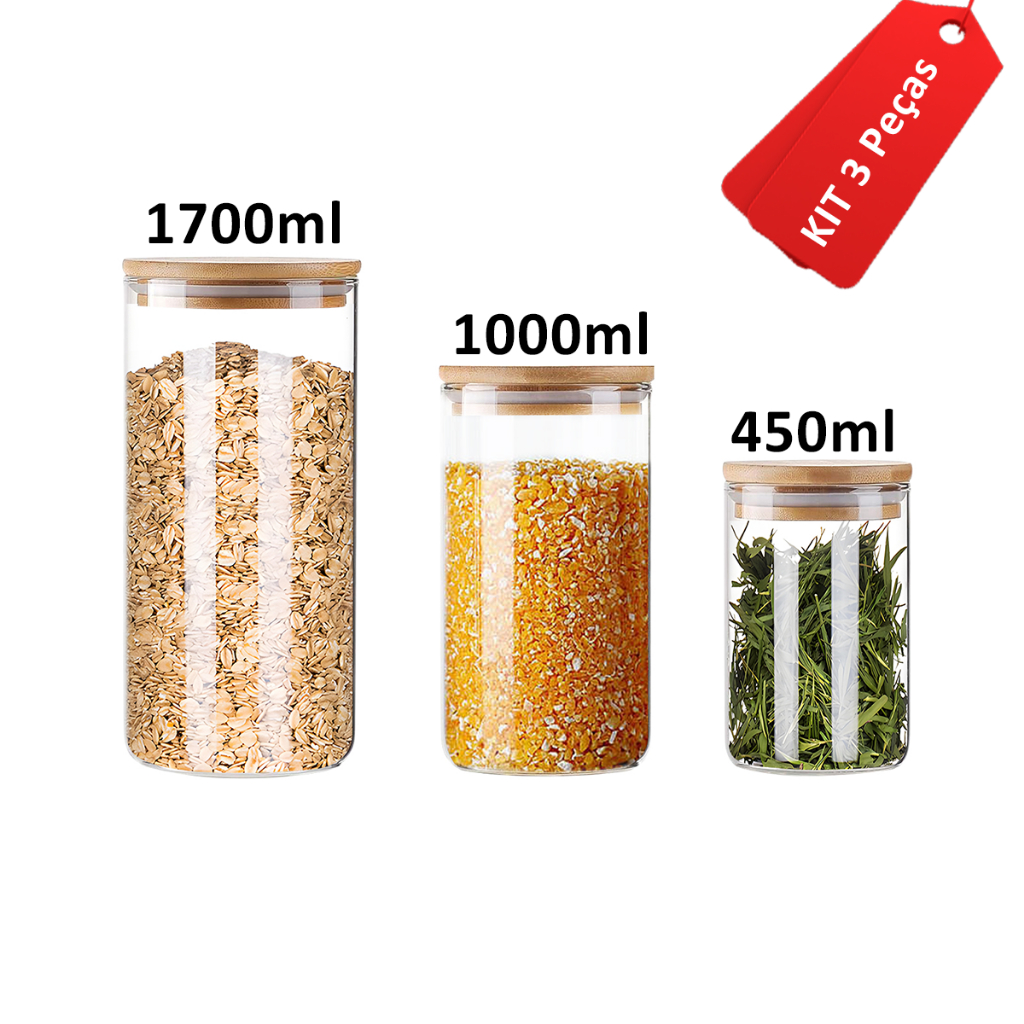 Kit 3 Potes De Vidro para Mantimentos com Tampa Bambu 1700ml 1000ml 450ml
