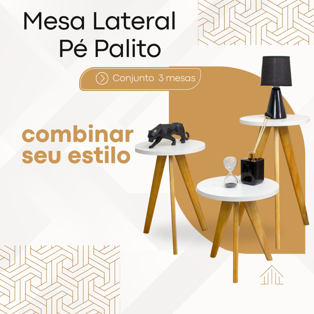 Kit Trio Jogo de Mesinha Lateral Redonda, Sala, Pé Palito Retro, Mesa de Cabeceira, Centro e Canto