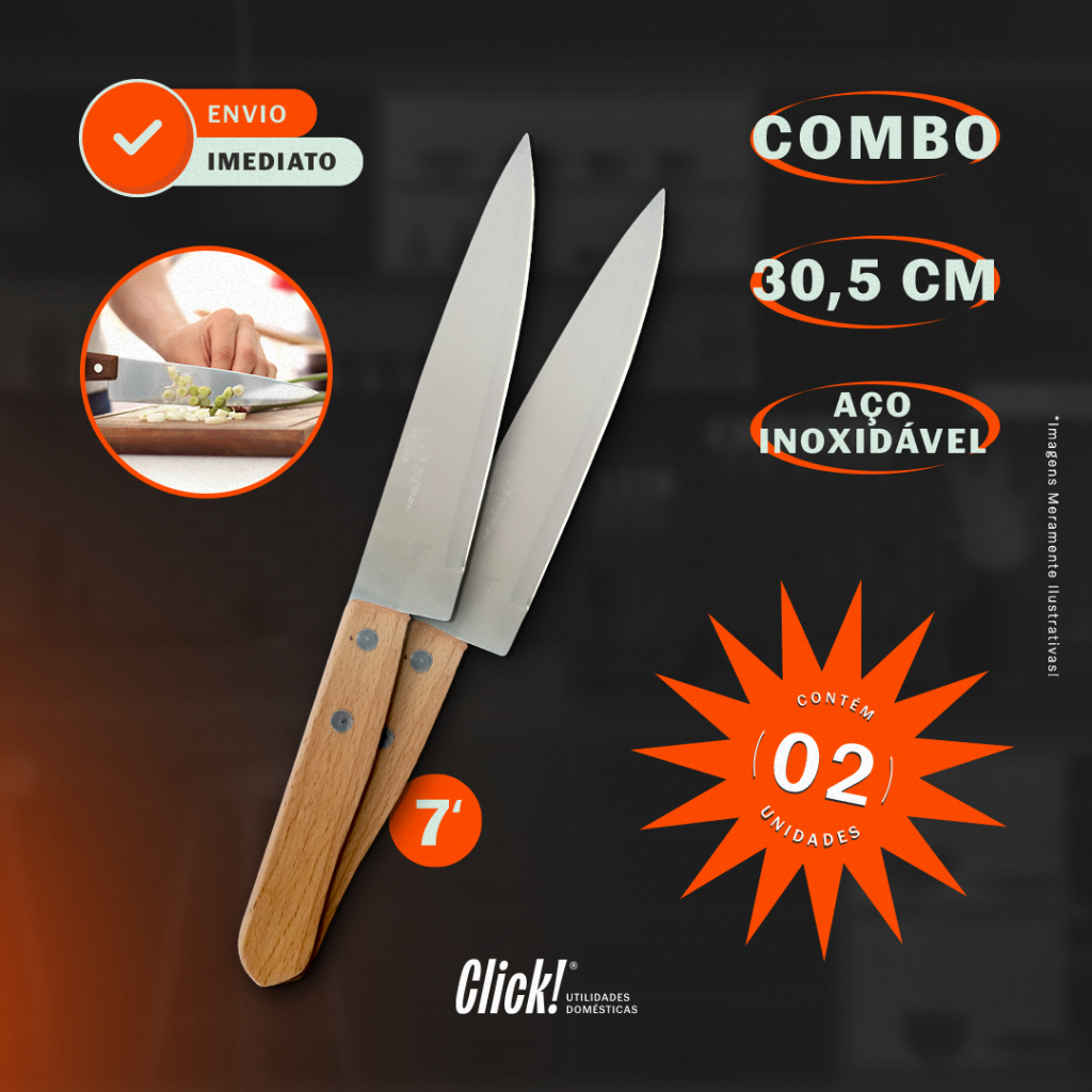 Kit 2 Faca De Cozinha Inox Profissional 7 Do Chef Cabo Madeira 30CM