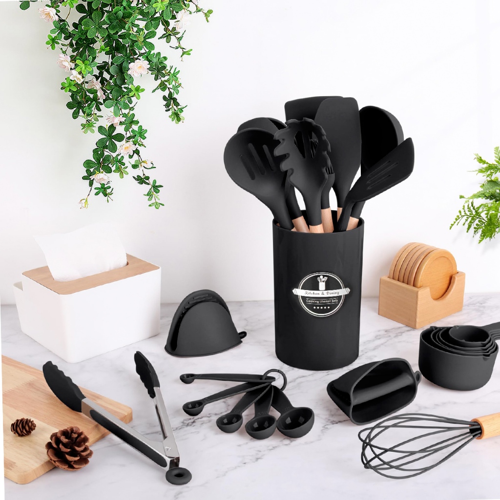 Jogo de Cozinha Kit C/12 Peças de Silicone, Utensílios e Copo Suporte para Cozinha Cabo de Madeira Su