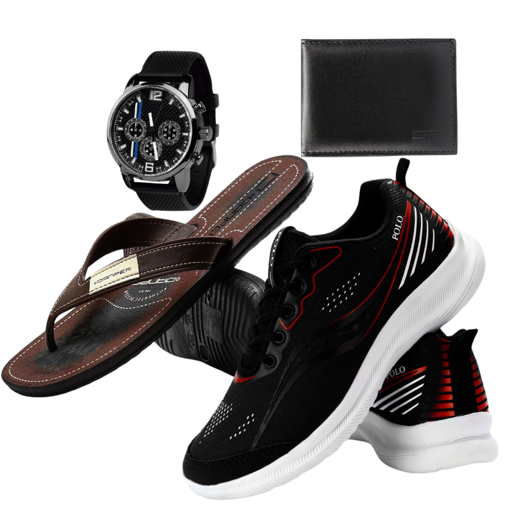 Kit Tênis Masculino Preto E Vermelho + Carteira + Relógio + Chinelo