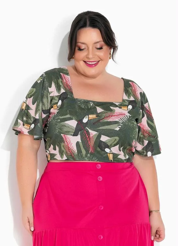 Marguerite - Cropped Folhas Verde com Mangas Amplas Plus Size