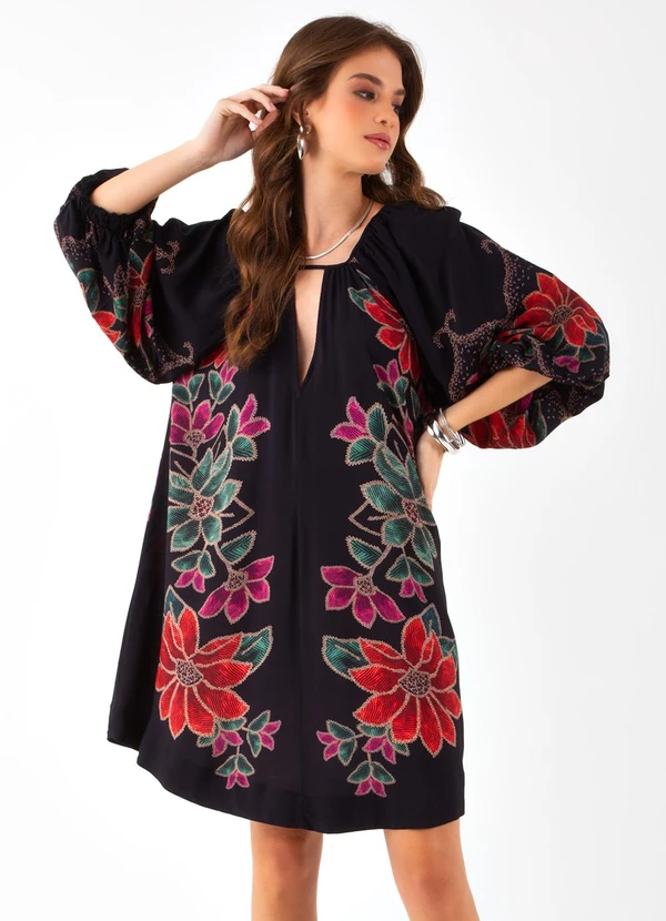 Farm - Vestido Curto de Viscose Floral Kátia Preto