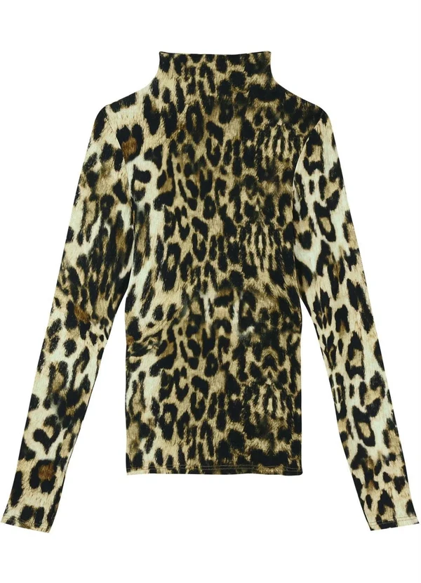 Malwee - Blusa Marrom Gola Alta Animal Print Feminino