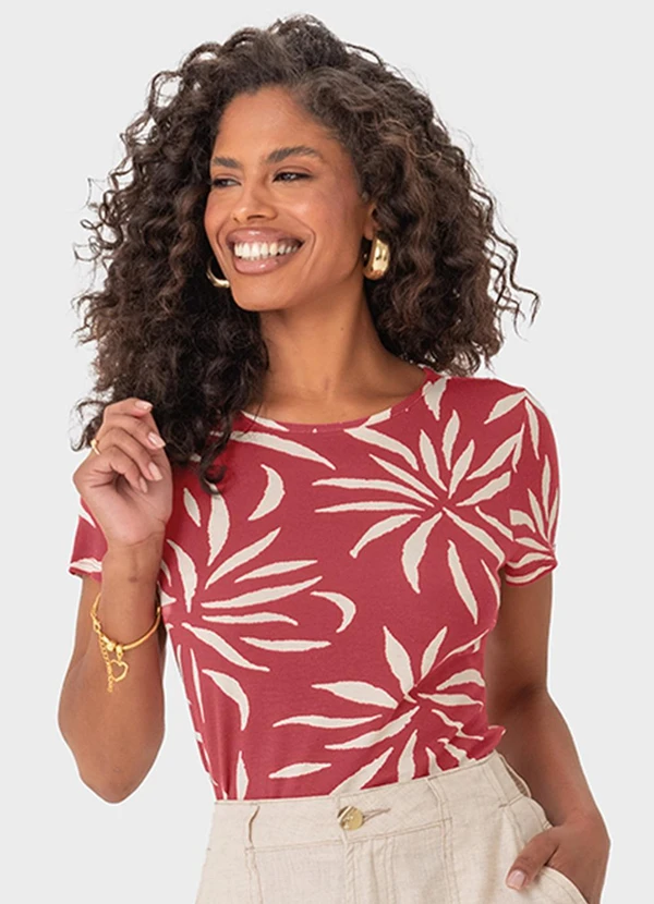 Malwee - Blusa Vermelha Folhas em Viscolinho Feminina