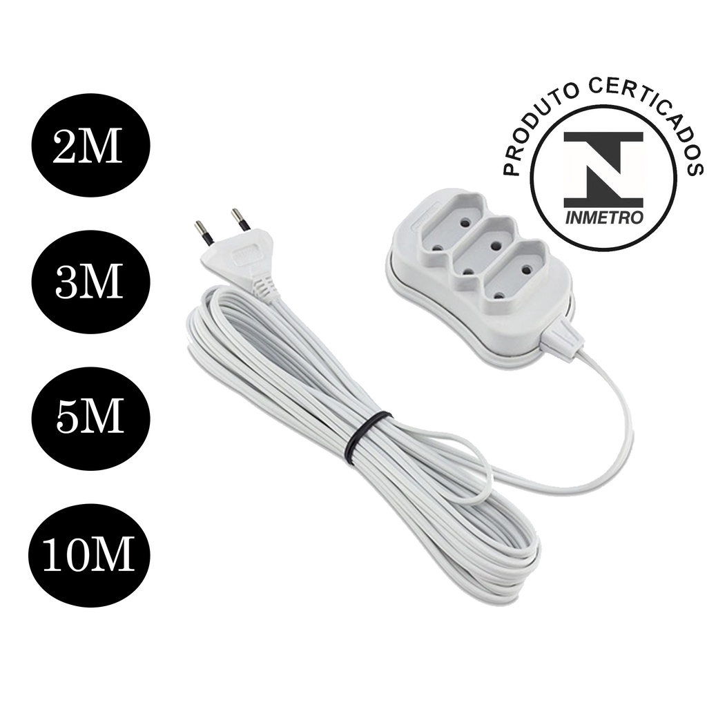 Extensão Elétrica de 2, 3, 5 e 10 metros com 3 tomadas bivolt 10A Plug 2 pinos Extensão de Energia