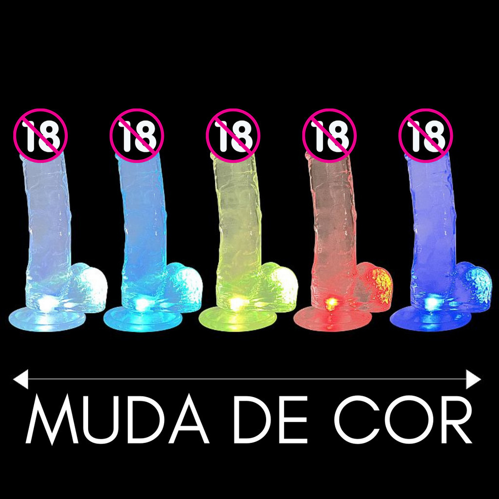 Prótese com LED RGB Pênis Grande Grosso Muda de Cor Ventosa Realístico Duplo Maciço Pele Lésbica 19 X 3,6cm Dildo Pau Pinto Borracha Silicone