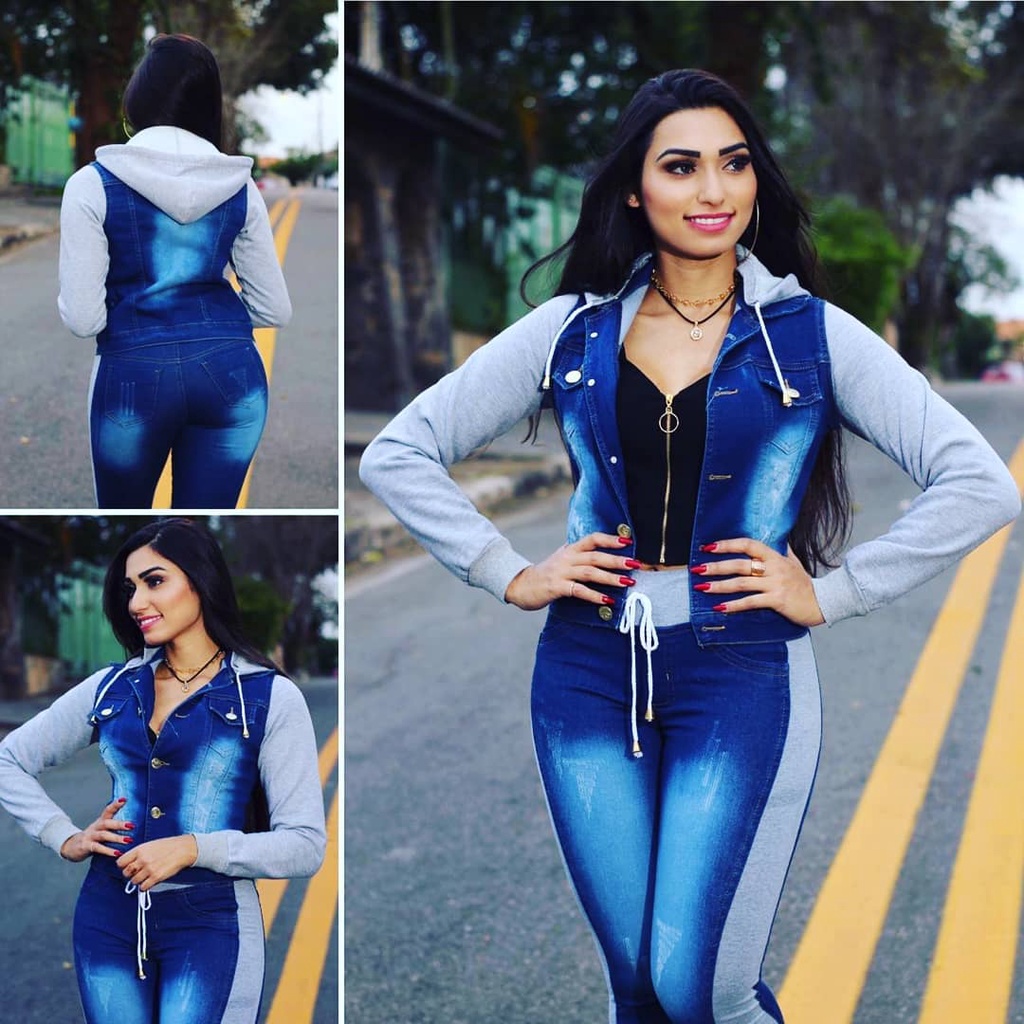 Conjunto Jeans Femenino Calça Jeans + Jaqueta Jeans Com Moletom e capuz conjunto de frio