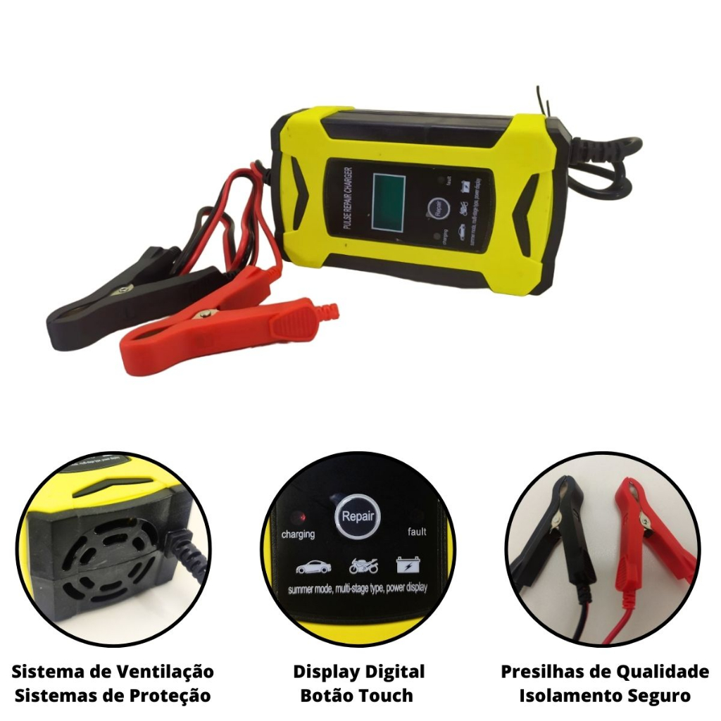 Carregador de Bateria 12V Automotivo e Moto Inteligente Portátil com Carga Lenta e Display Digital