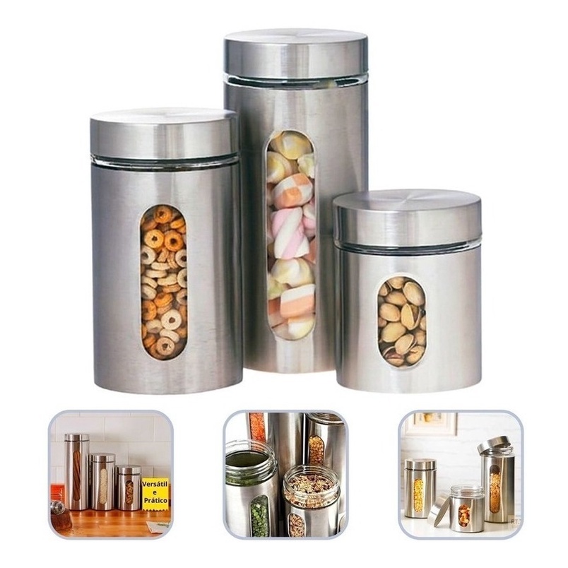 Potes De Mantimentos Em Inox E Vidro Conjunto 3 Peças