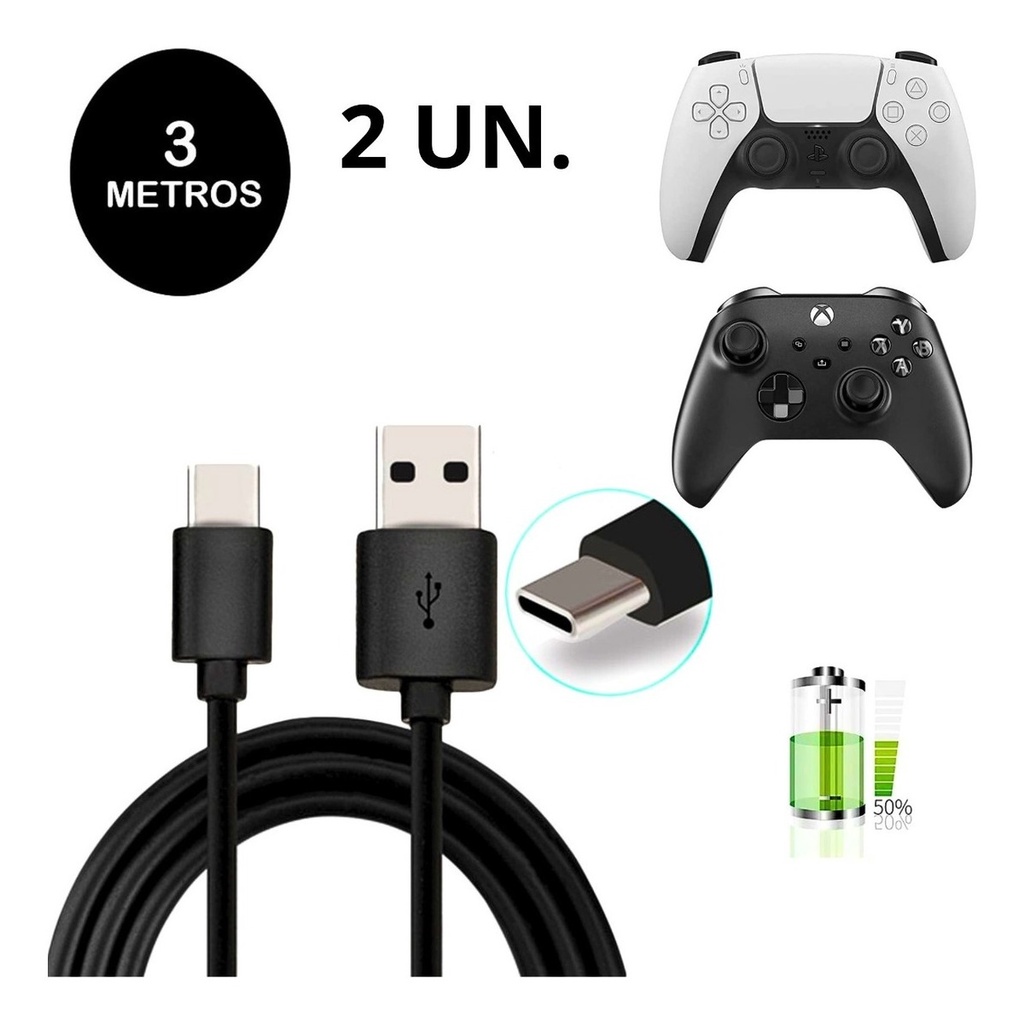 Kit 2 Cabo Carregador Usb-c 3m P/ Controle Ps5 E Xbox Series Celulares