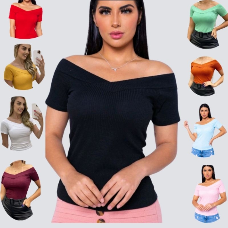 Camiseta Blusinha Ombro a Ombro Manga Curta Feminina Canelada Algodão Casual Blusa Moda Trabalho Super Fashion