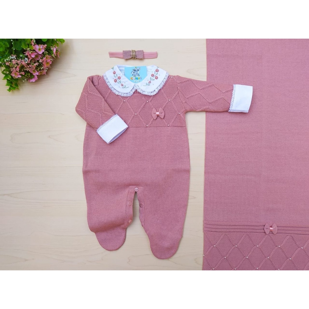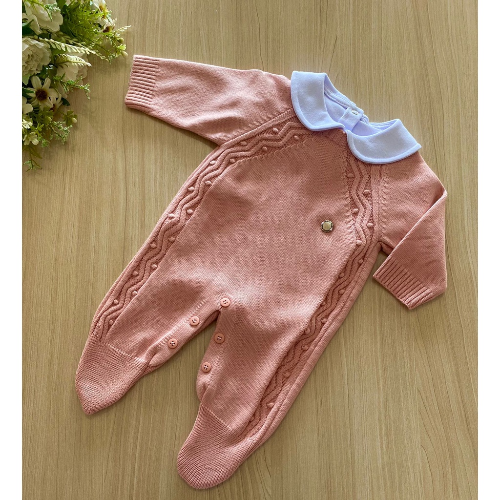 Saída de maternidade de menina macacão salmão 2 peças tricot