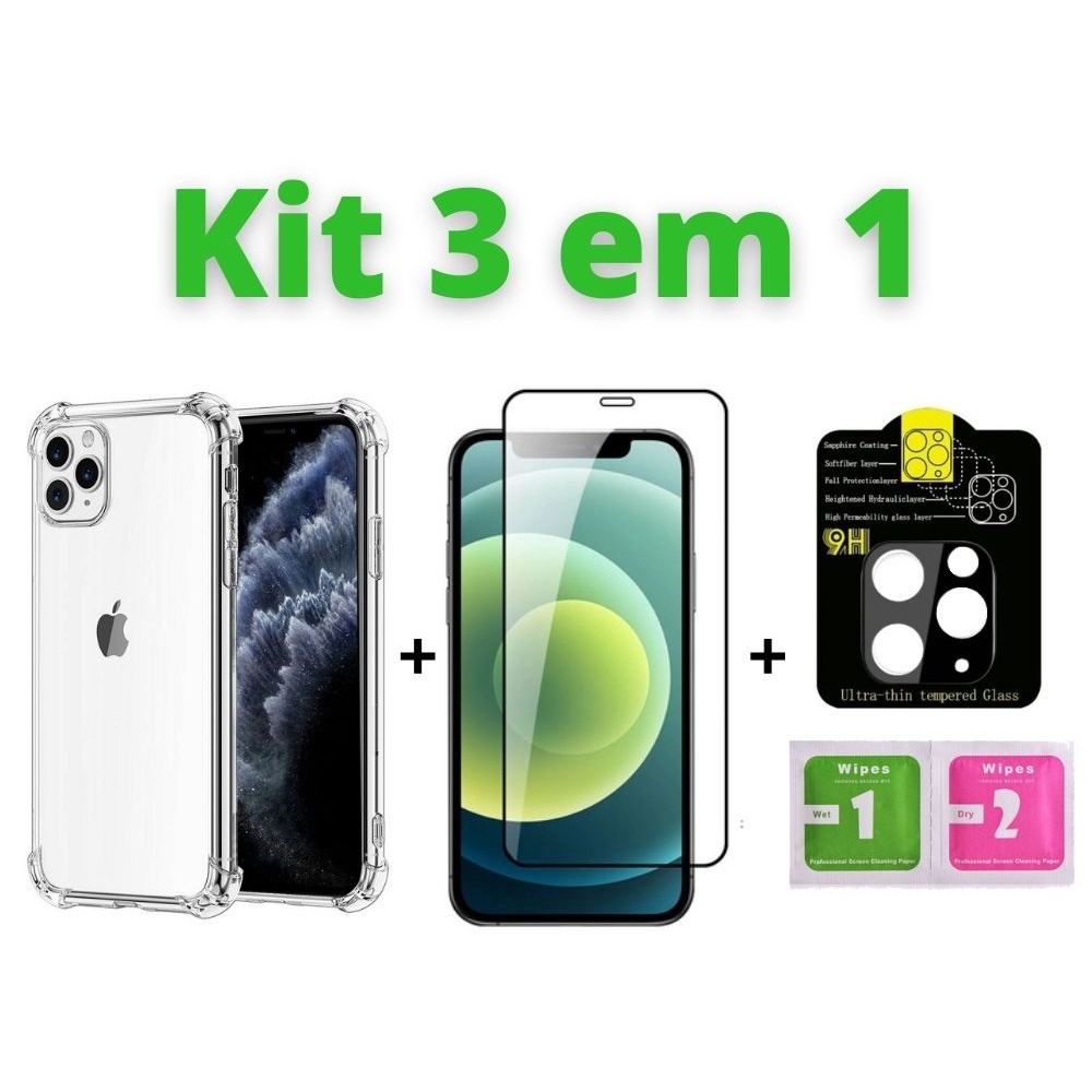 Kit 3em1 Compativel Com iPhone 11 / 11 Pro Max / 12 / 12 Pro / 12 Pro Max / 12 Mini - Capinha Anti-Impacto + Película 3D + Película da Câmera