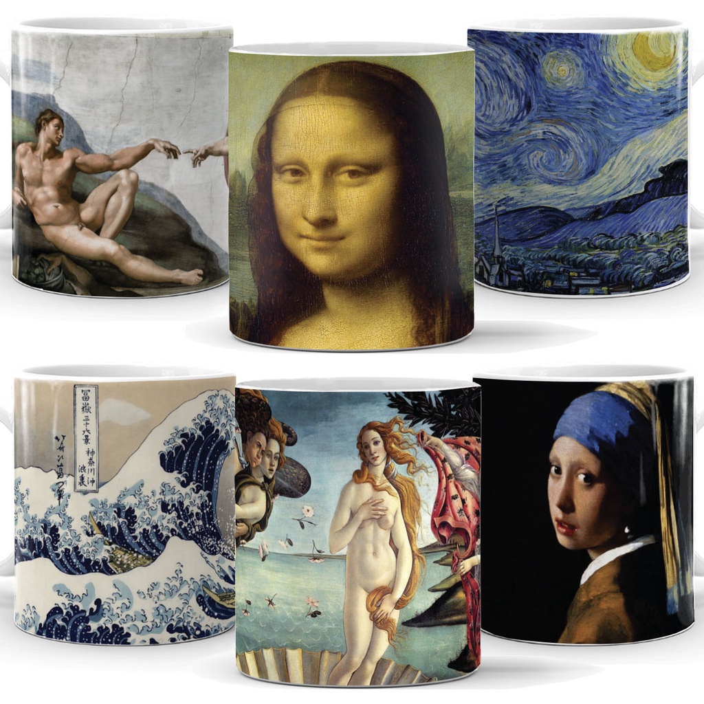 Canecas Arte Van Gogh Leonardo Da Vinci Michelangelo Botticelli Rafael Sanzio Escola Atenas Hokusai Vermeer Nascimento De Vênus Noite Estrelada Amendoeira Em Flor Rembrandt Quadro Canva Rembrandt Grant Wood Munch Picasso Salvador Dalí Porcelana