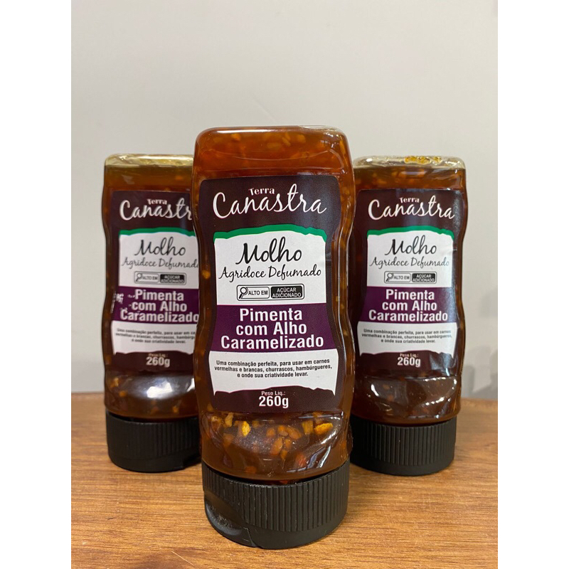 Kit com 3 molhos de alho caramelizado com pimenta Terra Canastra 260gr cada.