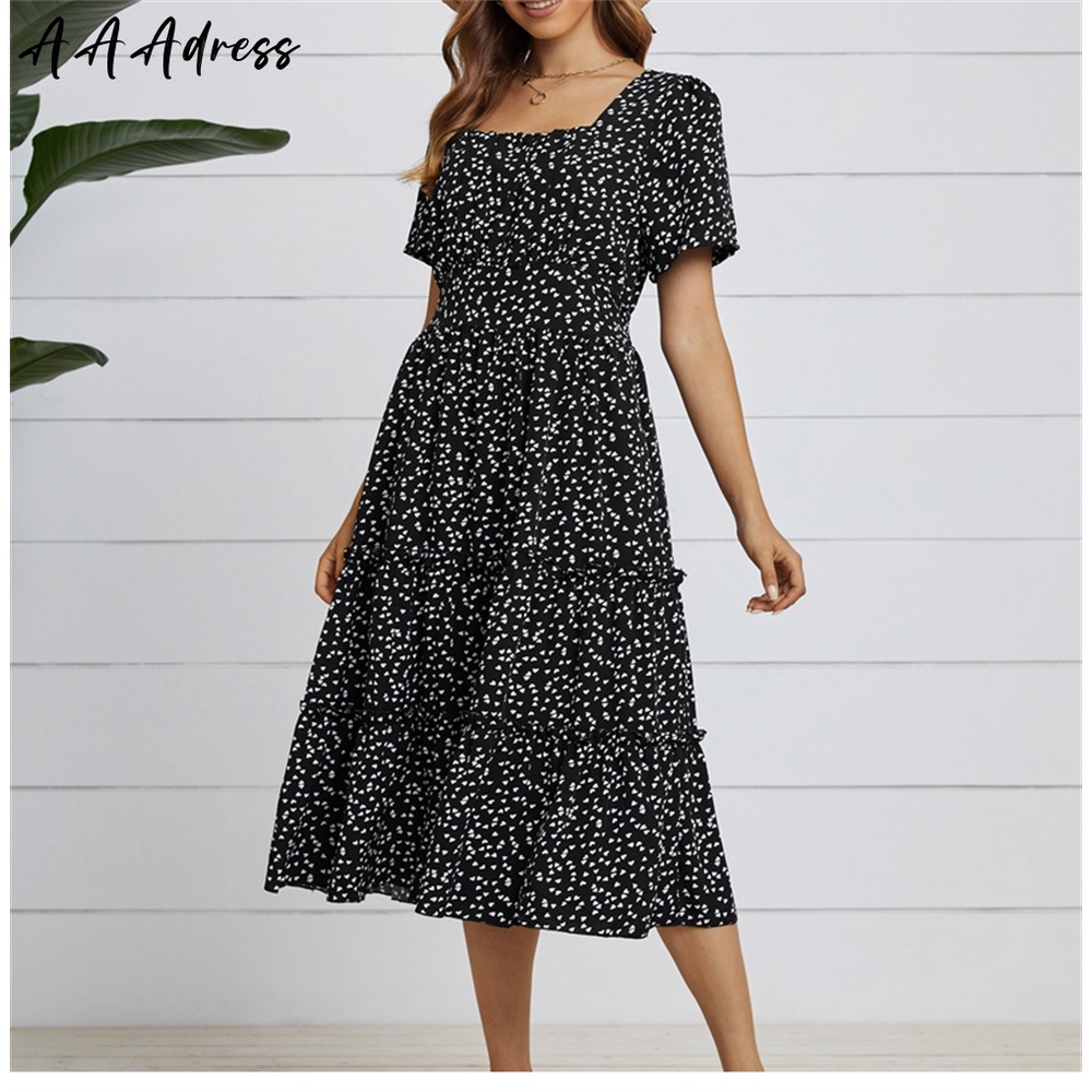 Verão Amor Padrão Dot Impressão Vestido Mulheres 2022 Nova Casual Manga Curta Gola Quadrada Ruffles Médio Longo Chiffon