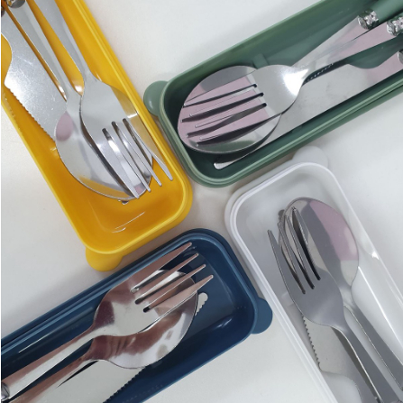 Talher Infantil e Adulto kit 4pçs Bichos sortidos p/Viagem Marmita Portátil Durável Com Estojo kit jogo de Talheres Infantil kids Colher Garfo Faca com 3 Peças em inox